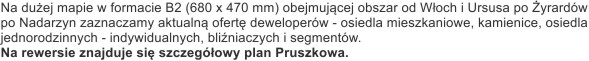 Na dużej mapie w formacie B2 (680 x 470 mm) obejmującej obszar od Włoch i Ursusa po Żyrardów oraz od Błonia po Nadarzyn zaznaczamy aktualną ofertę deweloperów - osiedla mieszkaniowe, kamienice, osiedla domów jednorodzinnych - indywidualnych, bliźniaczych i segmentów.